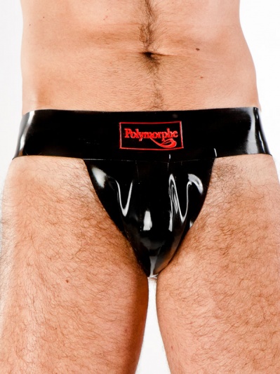 Two-sided, latex jock traditionally-styled, high-waisted with open posterior.