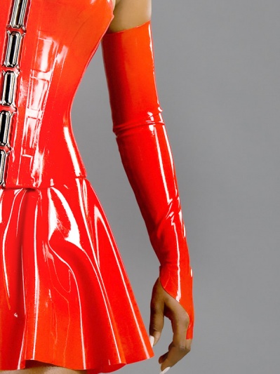 Sensual up to the shoulder latex arm sleeves with zipper, tapered V hand design and double finger attachment to keep gloves sexily in place.
